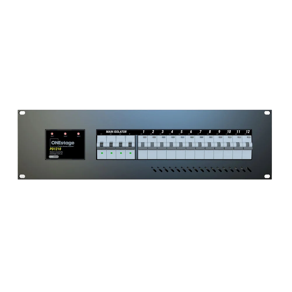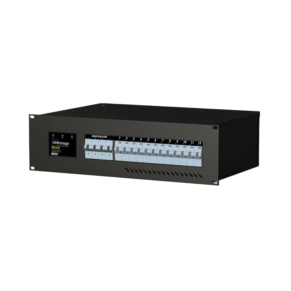 The OneStage PD1210-X + RPD5-T setup means less mucking around on-site. Up top, you’ve got the main PD1210-X, which is a 3-phase distro that splits your power into a mix of standard 10A outlets and 16A Trucon connections. The Trucon side of things is where this unit really shines. These are twist-and-lock connectors, so once they’re in, they’re not going anywhere. No accidental unplugging mid-set!